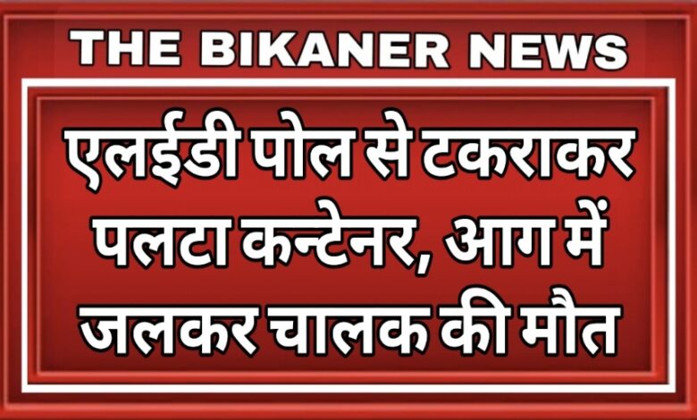 एलईडी पोल से टकराकर पलटा कन्टेनर, आग में जलकर चालक की मौत