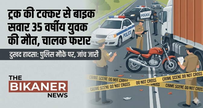 बीकानेर। जिले के लूणकरणसर थाना क्षेत्र में एक दर्दनाक सड़क हादसे में बाइक सवार युवक की मौत हो गई। हादसे के बाद ट्रक चालक वाहन सहित मौके से फरार हो गया। पुलिस ने मामला दर्ज कर जांच शुरू कर दी है।