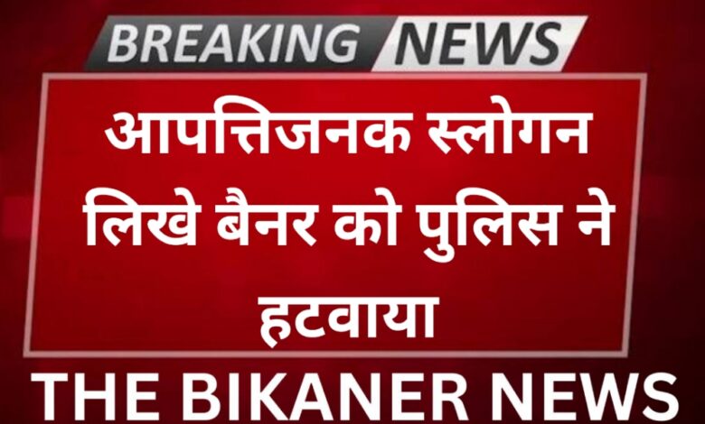 THE BIKANER NEWS:-बीकानेर, बीकानेर में कई जगहों पर लगे बैनर आये चर्चा में,ऐसे ही एक बैनर के नीचे लिखे थे आपत्तिजनक स्लोगन,शिकायत के बाद मौके पर पहुची पुलिस ने समझाईश कर बैनर को हटवाया।