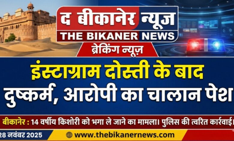 THE BIKANER NEWS:-बीकानेर। सोशल मीडिया पर दोस्ती और फिर विश्वासघात का एक गंभीर मामला बीकानेर के व्यास कॉलोनी थाना क्षेत्र से सामने आया है। यहाँ इंस्टाग्राम पर हुई दोस्ती के बाद एक युवक द्वारा 14 साल की नाबालिग किशोरी को बहला-फुसलाकर भगा ले जाने और उसके साथ दुष्कर्म करने की घटना घटित हुई है। पुलिस ने मामले की गंभीरता से जांच पूरी करते हुए आरोपी को पॉक्सो एक्ट का दोषी माना है और कोर्ट में चालान पेश कर दिया है।