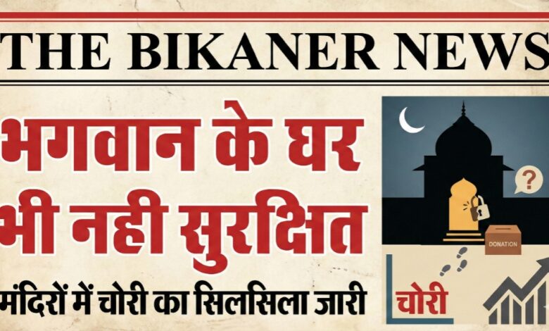THE BIKANER NEWS:-बीकानेर। बीकानेर जिले में इन दिनों चोरों के हौसले इतने बुलंद हैं कि अब भगवान के घर भी सुरक्षित नहीं रहे। पुलिस की रात्रि गश्त के दावों के बीच, जिले के अलग-अलग इलाकों में एक ही रात में कई मंदिरों में चोरी की वारदातों ने हड़कंप मचा दिया है। चोर न केवल नकदी और चांदी के छत्र ले उड़े, बल्कि राशन और तेल के पीपे तक नहीं छोड़े।