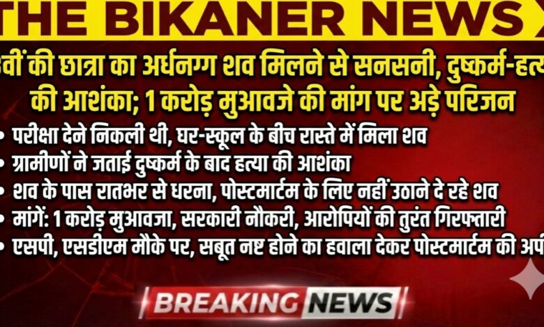 THE BIKANER NEWS:-बीकानेर: 8वीं की छात्रा का अर्धनग्न शव मिलने से सनसनी, दुष्कर्म-हत्या की आशंका; 1 करोड़ मुआवजे की मांग पर अड़े परिजन
