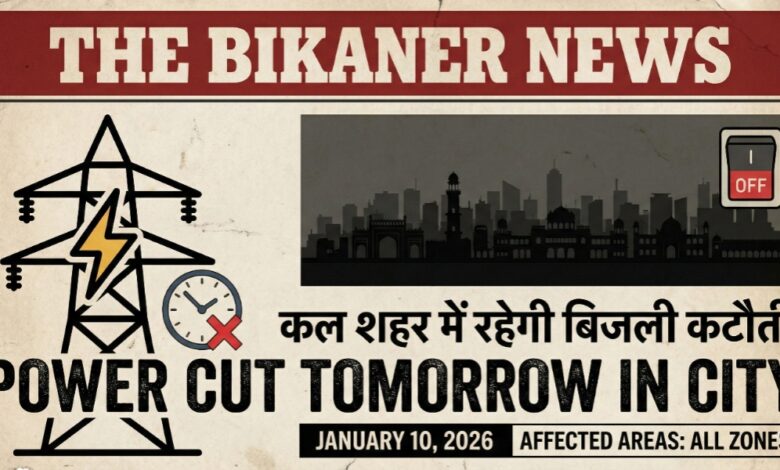 THE BIKANER NEWS:-बीकानेर। बिजली विभाग द्वारा जीएसएस/फीडर के रखरखाव और पेड़ों की आवश्यक छंटाई के चलते कल यानी शनिवार (10 जनवरी) को शहर के कई इलाकों में बिजली आपूर्ति बाधित रहेगी। विभाग ने अलग-अलग क्षेत्रों के लिए अलग-अलग समय सारणी जारी की है।