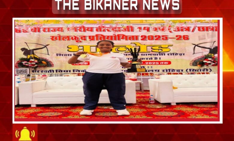 THE BIKANER NEWS:- बीकानेर, 69 वी राज्य स्तरीय प्रतियोगिता तीरंदाजी में हर्षिता ने फरहाया परचम, रोहिडा (सिरोही) में आयोजित की गई इस प्रतियोगिता में बीकानेर की हर्षिता विश्नोई ने 1 गोल्ड २ बॉन्च मंडल हासिल किया। एक गोल्ड दो बॉन्च सहित कुल तीन मेडल हामिल
