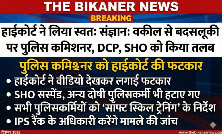 THE BIKANER NEWS:-जोधपुर के कुड़ी भगतासनी हाउसिंग बोर्ड थाने में वकील भरत सिंह राठौड़ के साथ हुई धक्का-मुक्की का मामला अब तूल पकड़ चुका है। राजस्थान हाई कोर्ट ने इस घटना पर स्वत: संज्ञान लेते हुए पुलिस प्रशासन के खिलाफ सख्त रुख अपनाया है।