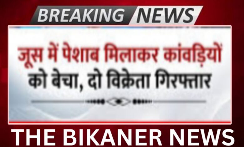 THE BIKANER NEWS:-कांवड़ियों को जूस में पेशाब मिलाकर बेचने के आरोप में पुलिस ने रविवार को दो विक्रेताओं को गिरफ्तार किया। पुलिस सूत्रों ने बताया कि बजरंग दल के एक पदाधिकारी ने दिल्ली-मेरठ राजमार्ग पर सिहानी चुंगी में जूस बेचने वाले जीशान और महताब पर उस मार्ग से गुजरने वाले कांवड़ियों को जूस में पेशाब मिलाकर देने की शिकायत पुलिस से की थी।