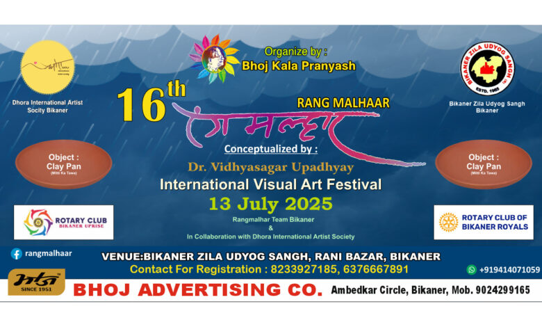 बीकानेर, 9 जुलाई। अच्छी बारिश की कामना के साथ रचनात्मकता और संस्कृति का संगम बनकर उभरने वाला रंग मल्हार इस बार अपने 16वें संस्करण में बीकानेर में आयोजित किया जाएगा। यह अंतरराष्ट्रीय दृश्य कला महोत्सव रविवार, 13 जुलाई को प्रातः 10 बजे से बीकानेर जिला उद्योग संघ सभागार, रानी बाजार में आयोजित होगा।