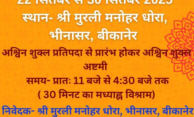 बीकानेर| शारदीय नवरात्रा पर मुरली मनोहर धोरा भीनासर में श्रीराम चरित मानस से नवाह्न पारायण पाठ का आयोजन 22 से 30 सितंबर तक प्रतिदिन सुबह 11 से 4.30 बजे तक किया जाएगा। भक्तों से आग्रह है कि श्रीराम चरित मानस पाठ का श्रवण कर पुण्यलाभ अर्जित करें। धोरे पर पहुंचने के लिए निशुल्क बस की सुविधा रहेगी।