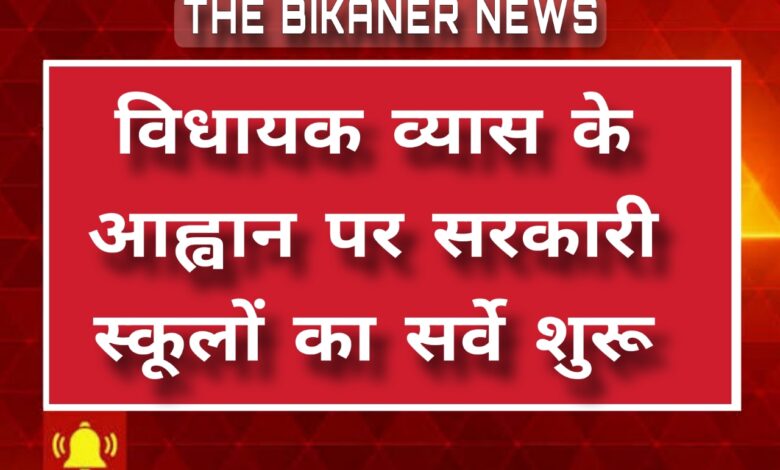 THE BIKANER NEWSबीकानेर, 28 जुलाई। बीकानेर (पश्चिम) विधानसभा क्षेत्र विधायक जेठानंद व्यास के आह्वान पर बीकानेर पश्चिम विधानसभा के सरकारी विद्यालयों का सर्वे कार्य सोमवार को शुरू हुआ।