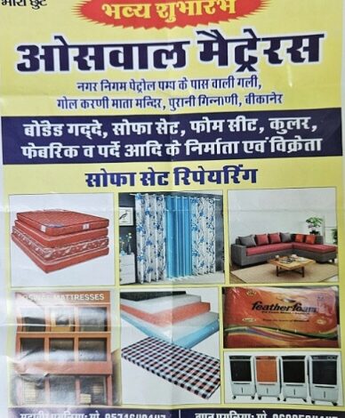 नगर निगम के पास स्थित पेट्रोल पंप के पास वाली गली में खुल रहे नये प्रतिष्ठान में ग्राहकों को ब्रांडेड कंपनी व स्वयं के निर्मित गद्दे,सोफा सेट,फोम सीट,कूलर,फेबरिक व पर्दे रियायती कीमतों पर दिए जा रहे है। दुकान संचालक महावीर पुगलिया ने बताया कि पिछले 60 वर्षों से पुस्तैनी इस फर्म का यह तीसरा प्रतिष्ठान है। जहां हस्त निर्मित गद्दे व घरेलूू उपयोग के लिये उत्पाद मिलते है। उन्होंने बताया कि जीएसटी के कम होने के बाद इनकी कीमतों में काफी फर्क पड़ा है। उन्होंने बताया कि नये उत्पाद के विक्रय के अलावा सोफा सेट रिपेयरिंग भी की जाती है। इस नये प्रतिष्ठान का भव्य शुभारंभ दीपावली के बाद किया जाएगा। पुगलिया ने बताया कि त्योहारी व शादी के सीजन को देखते हुए ग्राहकों को अच्छे ऑफर भी दिए जा रहे है। उन्होनें बताया कि उनके यहां निर्मित सामान प्रदेश के अनेक शहरों में भी विक्रय के लिये जाता है। उनके प्रतिष्ठान की पहचान विश्वसनीयता और क्वालिटी है। जिसके दम पर ही शहर के अलग अलग क्षेत्रों में इसी नाम से प्रतिष्ठान संचालित हो रहे है।