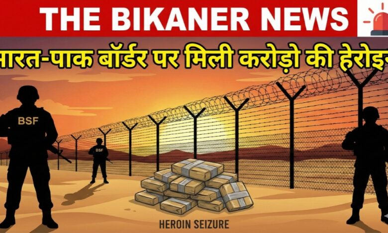 THE BIKANER NEWS:-बीकानेर/खाजूवाला।भारत-पाकिस्तान सीमा पर बीकानेर जिले के खाजूवाला क्षेत्र में सुरक्षा एजेंसियों ने एक बार फिर पाकिस्तान की ओर से की गई ड्रग तस्करी की कोशिश को नाकाम कर दिया है। सीमा सुरक्षा बल (BSF) और पुलिस की संयुक्त कार्रवाई में बॉर्डर के पास से करोड़ों रुपये की हेरोइन जब्त की गई है।
