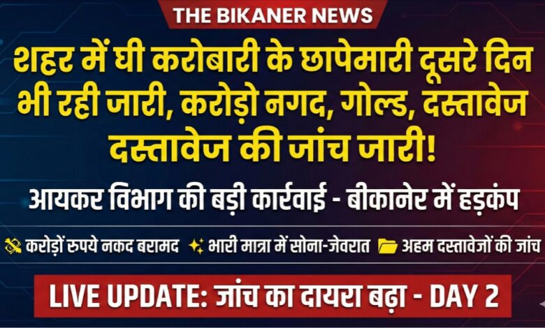 THE BIKANER NEWS:-बीकानेर:बीकानेर में आयकर विभाग की अन्वेषण शाखा द्वारा की जा रही छापेमारी ने घी कारोबार जगत में हड़कंप मचा दिया है। शहर की प्रतिष्ठित फर्म ‘मोहन लाल आशीष कुमार’ पर गुरुवार सुबह शुरू हुई यह कार्रवाई शुक्रवार को दूसरे दिन भी जारी रही। उत्तर प्रदेश और राजस्थान के अधिकारियों की संयुक्त टीम द्वारा की जा रही इस जांच में अब तक करोड़ों रुपये की अघोषित संपत्ति के संकेत मिले हैं।