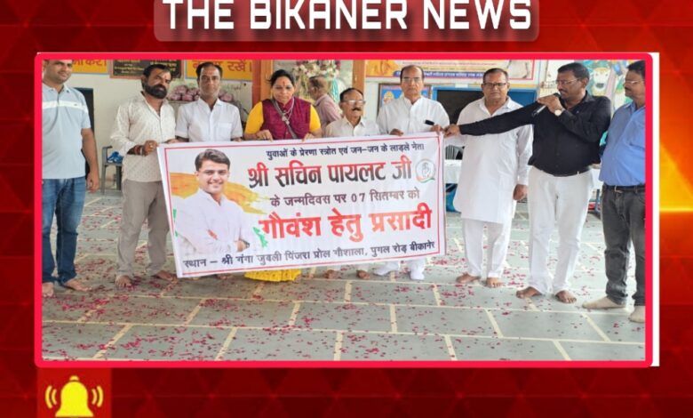 THE BIKANER NEWS:-बीकानेर, कांग्रेस नेता नित्यानंद पारीक के संयोजन में पूर्व मुख्यमंत्री राष्ट्रीय कांग्रेस के महामंत्री सचिन पायलट का जन्मदिन गौ शाला में गौ प्रसादी ,भजन , कीर्तन , गो आरती कर मनाया कांग्रेस नेता नित्यानंद पारीक के संयोजन में कांग्रेस के युवा नेता सचिन पायलट का 47 वा जन्मदिन गौ शाला में गौ वंश के लिए चौदह क्विंटल प्रसादी खिलाकर मनाया गया इस के साथ भजन , कीर्तन , सत्संग कर के अनेक गौ भक्तों ने सचिन पायलट के उज्ज्वल राजनीतिक भविष् की कामना की इस अवसर पर कांग्रेस नेता नित्यानंद पारीक , देहात महिला कांग्रेस की अध्यक्ष शशिकला राठौर , कांग्रेस सेवा दल के नर्सिंग दास व्यास ,एडवोकेट विनोद जोशी , मनोज पारीक, विष्णुदत्त ओझा, जगदीश जोड़ी, पृथ्वी सिंह पंवार ने विचार रखते हुए सचिन पायलट के राजनीतिक उज्जवल भविष्ट की कामना की। साथ ही परम गौ सेवक देवकिशन चांडक ने भी सचिन पायलट के राजनीतिक उज्जवल भविष्य की कामना की