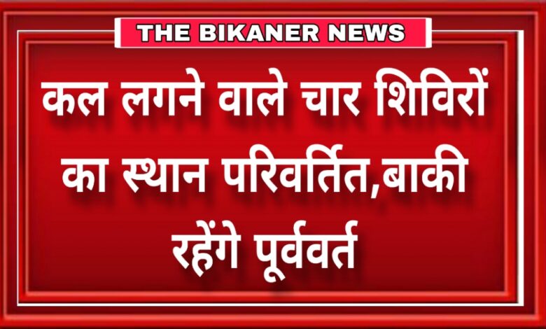 अतिरिक्त जिला कलेक्टर (नगर) तथा बीकानेर (पश्चिम) विधानसभा क्षेत्र के निर्वाचक पंजीयन अधिकारी श्री रमेश देव ने बताया कि माहेश्वरी सदन के स्थान पर राजकीय बालिका उच्च माध्यमिक विद्यालय जस्सूसर गेट, रामा भवन चोपड़ा बाड़ी के स्थान पर जनता क्लिनिक चोपड़ा बाड़ी, चूनगर मोहल्ला के स्थान पर राजकीय उच्च माध्यमिक विद्यालय न्यू तेलीवाड़ा तथा राजकीय उच्च राजकीय बालिका उच्च माध्यमिक विद्यालय महर्षि दयानंद मार्ग पर आयोजित होने वाला शिविर भैरव रत्न मातृ राजकीय उच्च माध्यमिक विद्यालय बेगानी चौक में आयोजित किया जाएगा। शेष 16 स्थान पर शिविरों का आयोजन पूर्ववर्त होगा। श्री देव ने सभी सुपरवाइजर्स, बूथ लेवल अधिकारियों और तकनीकी कर्मियों को समय पर पहुंचकर कार्य में गति लाने के निर्देश दिए हैं।