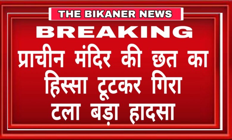 THE BIKANER NEWS:-बीकानेर, बीकानेर। शहर के ऐतिहासिक चौतीना कुआं क्षेत्र स्थित प्राचीन रघुनाथजी मंदिर की छत का एक हिस्सा शनिवार को अचानक गिर गया। सौभाग्य से हादसे के समय मंदिर परिसर में कोई मौजूद नहीं था, जिससे कोई जनहानि नहीं हुई।