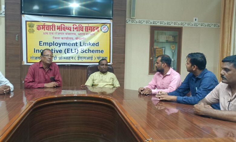 केन्द्रीय मंत्रिमंडल द्वारा स्वीकृत रोजगार से जुडी प्रोत्साहन योजना ईएलआई के प्रचार प्रसार हेतु कर्मचारी भविष्य निधि संगठन जिला कार्यालय बीकानेर एवं बीकानेर जिला उद्योग संघ के मध्य चर्चा हुई | चर्चा में ईएलआई योजना के उद्देश्यों, लाभों तथा इसके क्रियान्वयन की प्रक्रिया के बारे में विस्तारपूर्वक जानकारी प्रदान की गई | वरिष्ठ सामाजिक सुरक्षा सहायक किशोर गहलोत एवं किशनलाल ने बताया कि यह योजना रोजगार सृजन को प्रोत्साहित करने के उद्देश्य से एक नई सरकारी पहल है यह योजना कर्मचारी भविष्य निधि संगठन में नामांकित पहली बार नोकरी करने वाले कर्मचारियों को लाभान्वित करती है | इसमें संगठित क्षेत्र के नियोक्ताओं को कर्मचारियों को नियुक्त करने पर प्रोत्साहन राशि प्रदान की जाती है | यह योजना 1 अगस्त 2025 और 31 जुलाई 2027 के बीच बनाई गई नई नोकरियों को कवर करेगी | इन लाभों को प्राप्त करने के लिए कर्मचारियों को कर्मचारी भविष्य निधि संगठन में नामांकन करवाना होगा | ईएलआई योजना के पात्र कर्मचारी की मासिक आय 1 लाख रूपये ससे कम होनी चाहिए | अपने आधार को बैंक खाते और यूएएन के साथ जोड़ा जाना होगा | इस योजना का मुख्य उद्देश्य यह है कि इससे नियोक्ता द्वारा भर्ती प्रक्रिया को बढावा मिलेगा और कर्मचारियों को भी लाभ मिलेगा जिससे युवाओं के लिए रोजगार के अवसर बढ़ेंगे | इस अवसर पर बीकानेर जिला उद्योग संघ अध्यक्ष द्वारकाप्रसाद पचीसिया, राजाराम सारडा, कन्हैयालाल बोथरा, विमल सिंह चौरडिया, मनीष सिपानी, नरेश सुराणा, रिषभ बोथराऔर मनमोहन गहलोत आदि उपस्थित हुए |